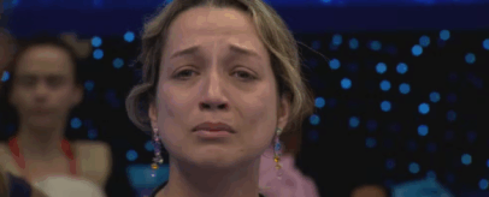 Mulher chorando em evento com fundo azul e luzes, com outras pessoas desfocadas ao fundo.