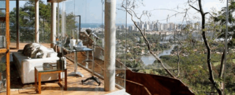 Casa de vidro com vista para a cidade e lago, com sofá branco e mesa de centro. Arquitetura moderna.