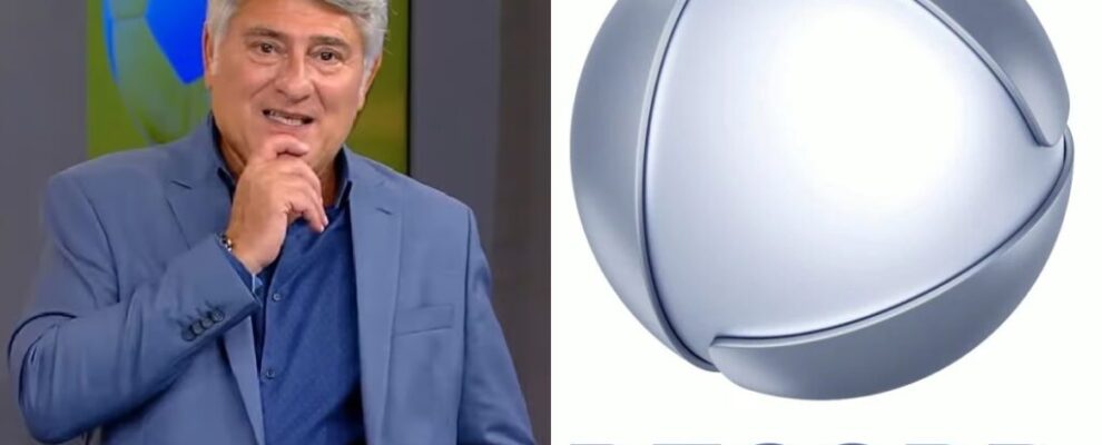 Apresentador Milton Neves com a mão no queixo, ao lado do logo da Record TV.
