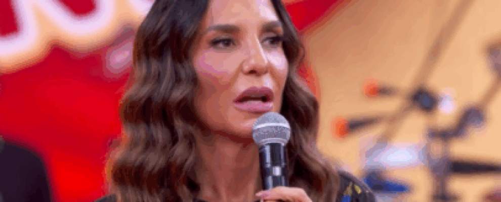 Ivete Sangalo falando ao microfone em um programa de TV com fundo colorido e desfocado.