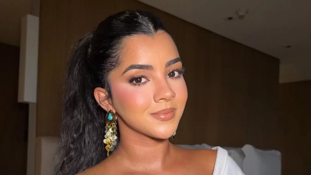 Influenciadora brasileira Gkay posa para foto com maquiagem e brinco dourado com pedra azul.