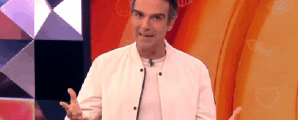 Tadeu Schmidt, apresentador do BBB 23, gesticula com as mãos em frente a um cenário colorido com formas geométricas e desenh…
