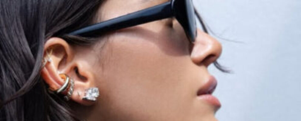 Mulher com óculos escuros e joias chamativas na orelha, com foco no perfil e nos acessórios.