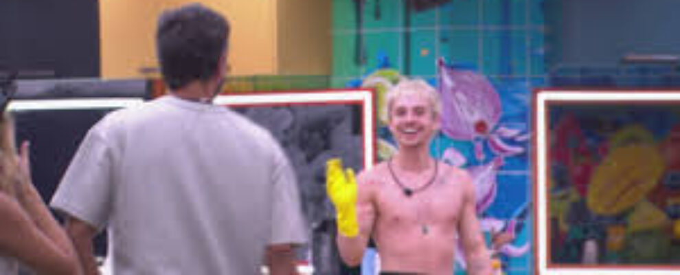 Participante do BBB 23 com luvas amarelas e cabelo loiro, sorrindo e acenando para alguém fora de quadro.