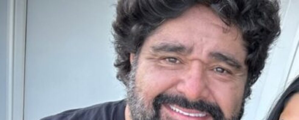 O ator e comediante Fábio Porchat sorri para a câmera em um close-up, com parte do rosto de uma mulher visível ao lado.