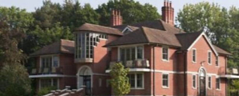 Mansão de tijolos vermelhos com chaminés e janelas grandes, cercada por árvores verdes e gramado.