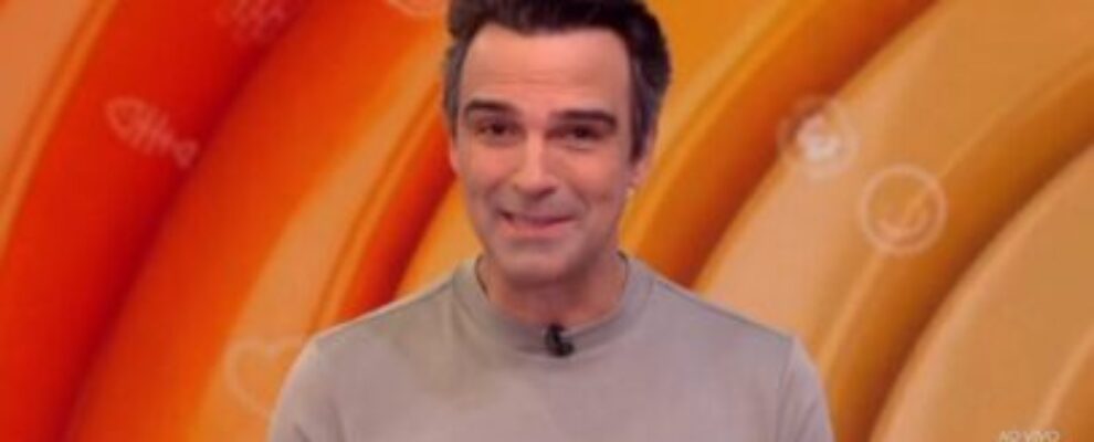 Tadeu Schmidt sorri em frente a um fundo laranja com desenhos abstratos e o logo da Globo ao vivo. Apresentador do BBB.