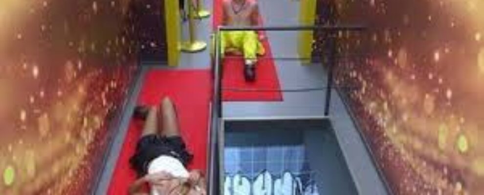 Mulher deitada em tapete vermelho e homem sentado em carrinho, em corredor decorado com luzes douradas.