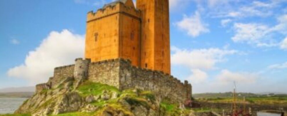 Castelo de Doonagore em Doolin, Irlanda, com um barco à vela ancorado perto de uma ponte.
