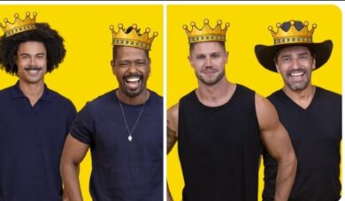 Quatro homens sorrindo com coroas douradas na cabeça em um fundo amarelo. Homens são Arthur Aguiar, Paulo André, Pedro Scoob…