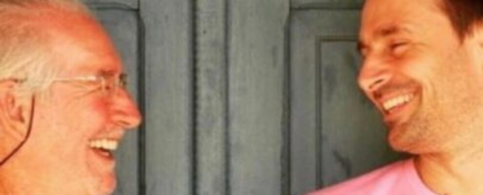 Dois homens sorriem um para o outro em frente a uma porta de madeira desgastada. Um deles é mais velho e usa óculos, o outro…