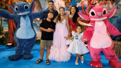 E se você pensa que acabou, está muito enganado! O ponto alto da festa, que deixou todo mundo de queixo caído, foi o bolo. Não era um bolinho qualquer, não, minha gente! Estamos falando de um bolo GIGANTE de cinco andares, todo decorado caprichosamente com o tema da festa. Tinha elementos praianos, o nome da Zaya em destaque e, claro, o Stitch e sua turma. Cada detalhe foi pensado para criar um universo mágico para a pequena. A coluna apurou que a festa foi um verdadeiro acontecimento, reunindo amigos e familiares para celebrar a vida da herdeira de Simone Mendes.