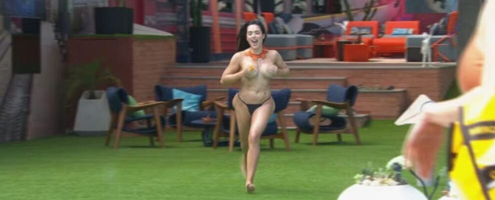 Participante do BBB 24 corre na área externa da casa usando apenas um biquíni fio dental e um colar. Imagem de reality show.