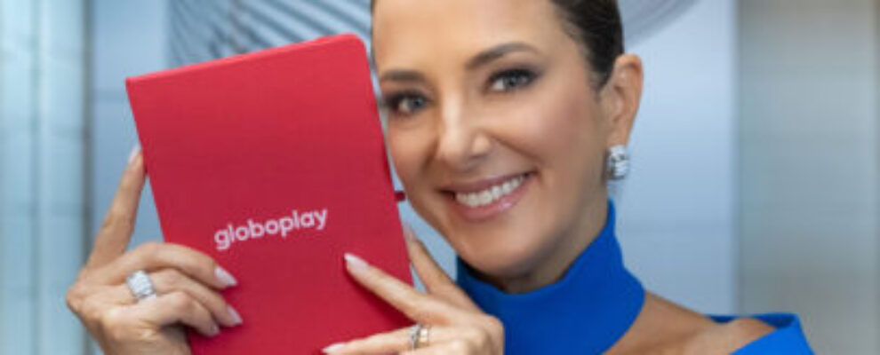 Apresentadora brasileira segura um caderno vermelho com o logo do Globoplay, sorrindo para a câmera.