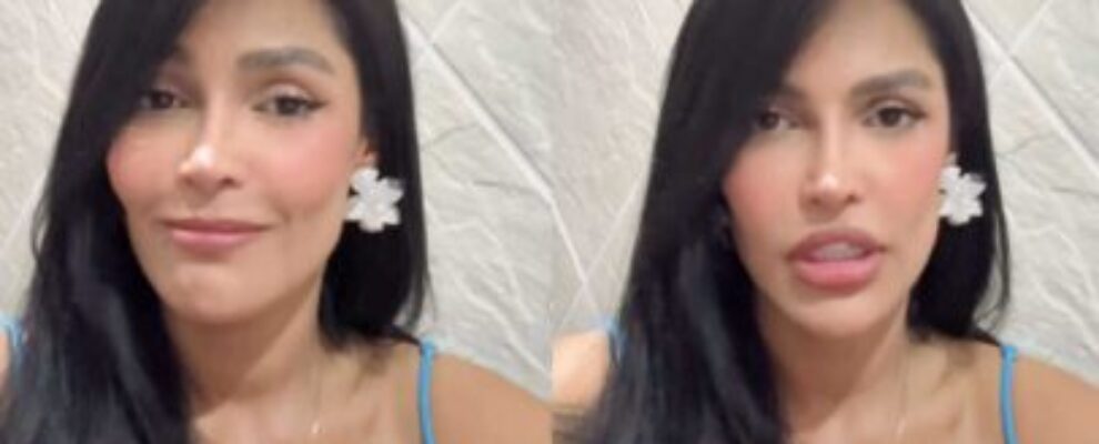 Mulher com cabelos pretos longos e brincos de flor branca, sorrindo em uma imagem e falando em outra. Tatuagem no colo.