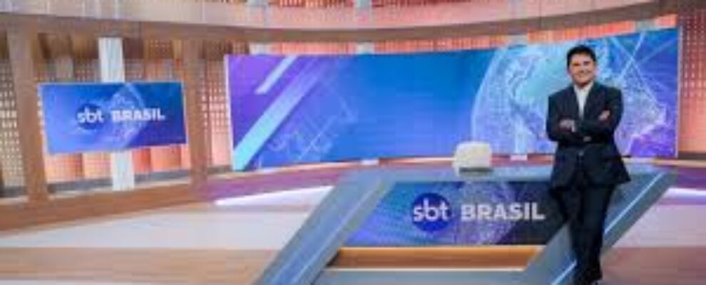Apresentador do SBT Brasil em estúdio com telas exibindo o logo do canal e globo terrestre.