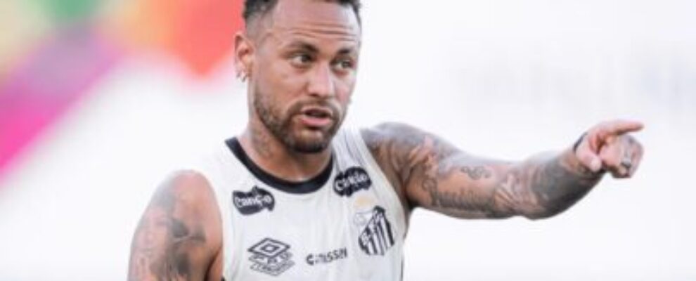 O jogador Neymar Jr. em treinamento com a camisa do Santos FC, apontando para o lado.