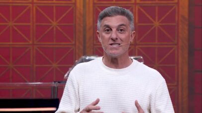 Luciano Huck em estúdio com fundo vermelho e detalhes dourados, vestindo suéter branco e gesticulando.