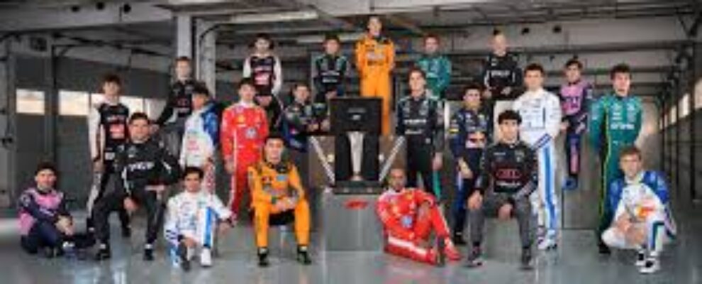 Grupo de pilotos de corrida posando para foto oficial em uma garagem, vestindo seus macacões coloridos.