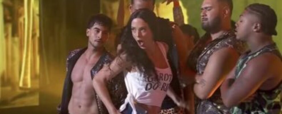 Cantora Anitta em performance com dançarinos, usando top branco com estampa 'Garota do Rio' e shorts jeans.