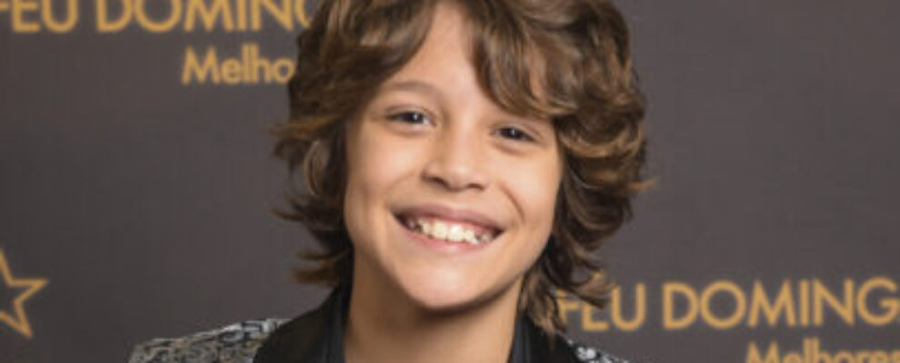 Menino sorridente com cabelo castanho e ondulado, vestindo um terno estampado, em frente a um fundo com a inscrição FÉU DOM…