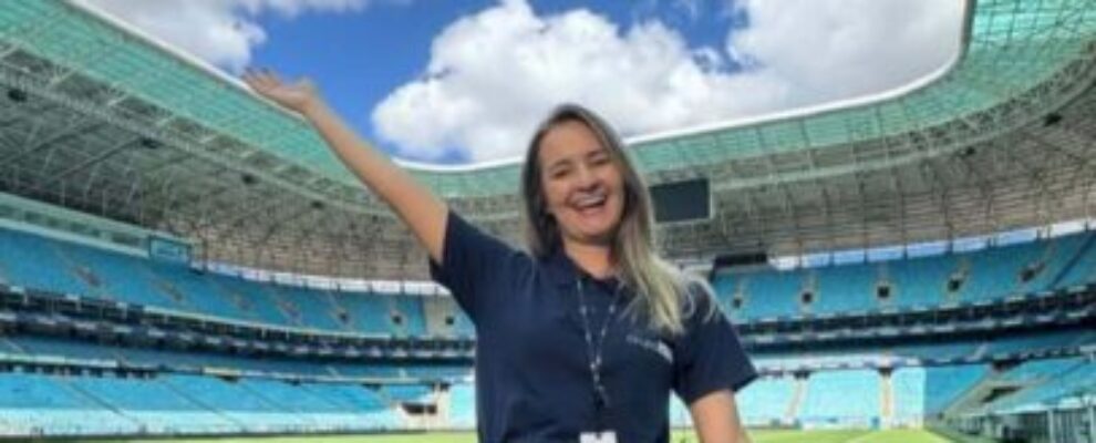 Mulher sorri e acena em estádio de futebol com arquibancadas azuis e campo verde sob céu azul.