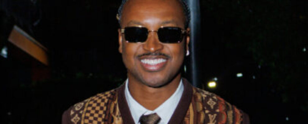 O rapper americano Hit-Boy sorri para a câmera usando óculos escuros e um colete estampado sobre uma camisa e gravata.