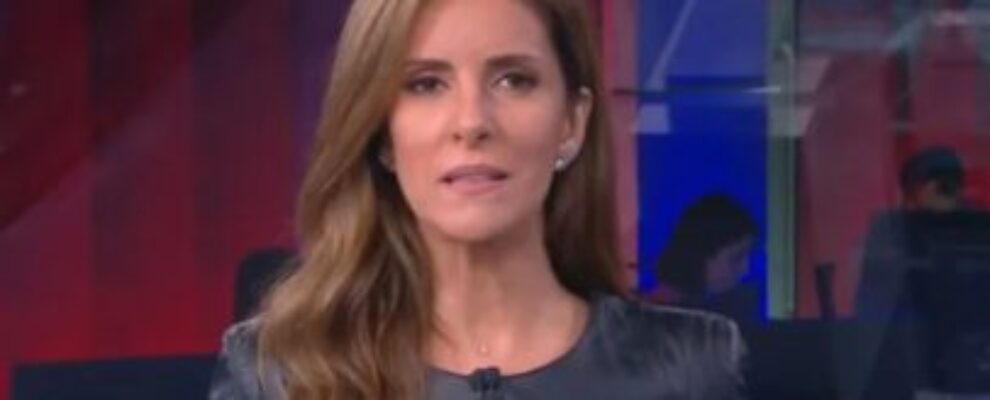 Apresentadora de telejornal com cabelo castanho ondulado e um colar discreto, em um estúdio com fundo vermelho e azul.