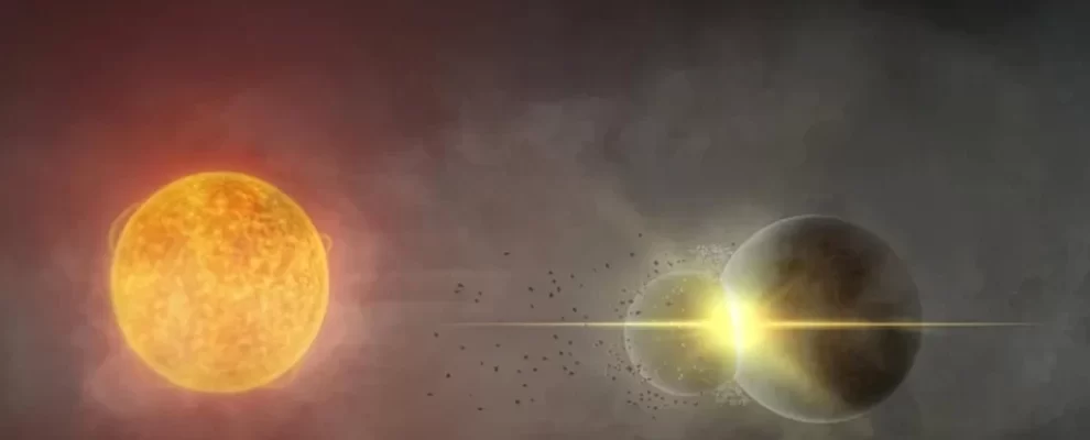 Ilustração de um sol brilhante e um planeta em processo de colisão com outro corpo celeste, com detritos espalhados.