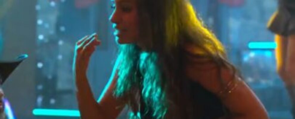 Mulher com cabelos longos e escuros, usando um top preto e pulseira dourada, em um ambiente com luzes azuis e amarelas.