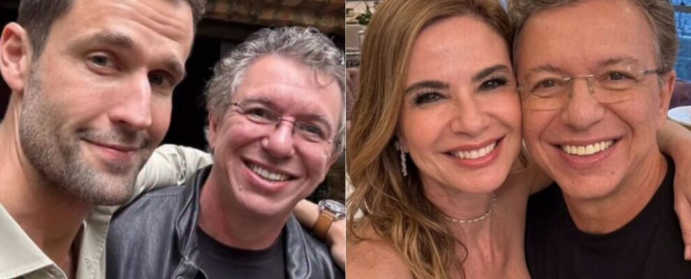Foto de Marcos Mion e Paulo Vieira, e outra de Ana Maria Braga e Gilberto Gil sorrindo.