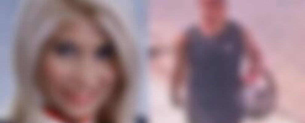 Mulher loira com maquiagem azul e homem de boné rosa e camiseta escura andando com uma bolsa.