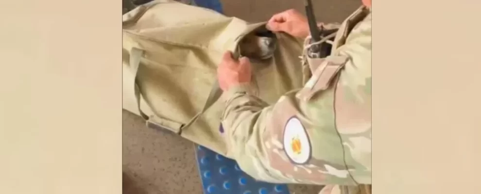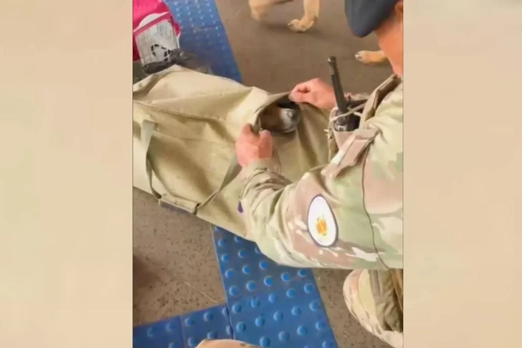 Militar em uniforme camuflado inspeciona um cachorro escondido em uma bolsa de lona, com outros cães ao fundo.