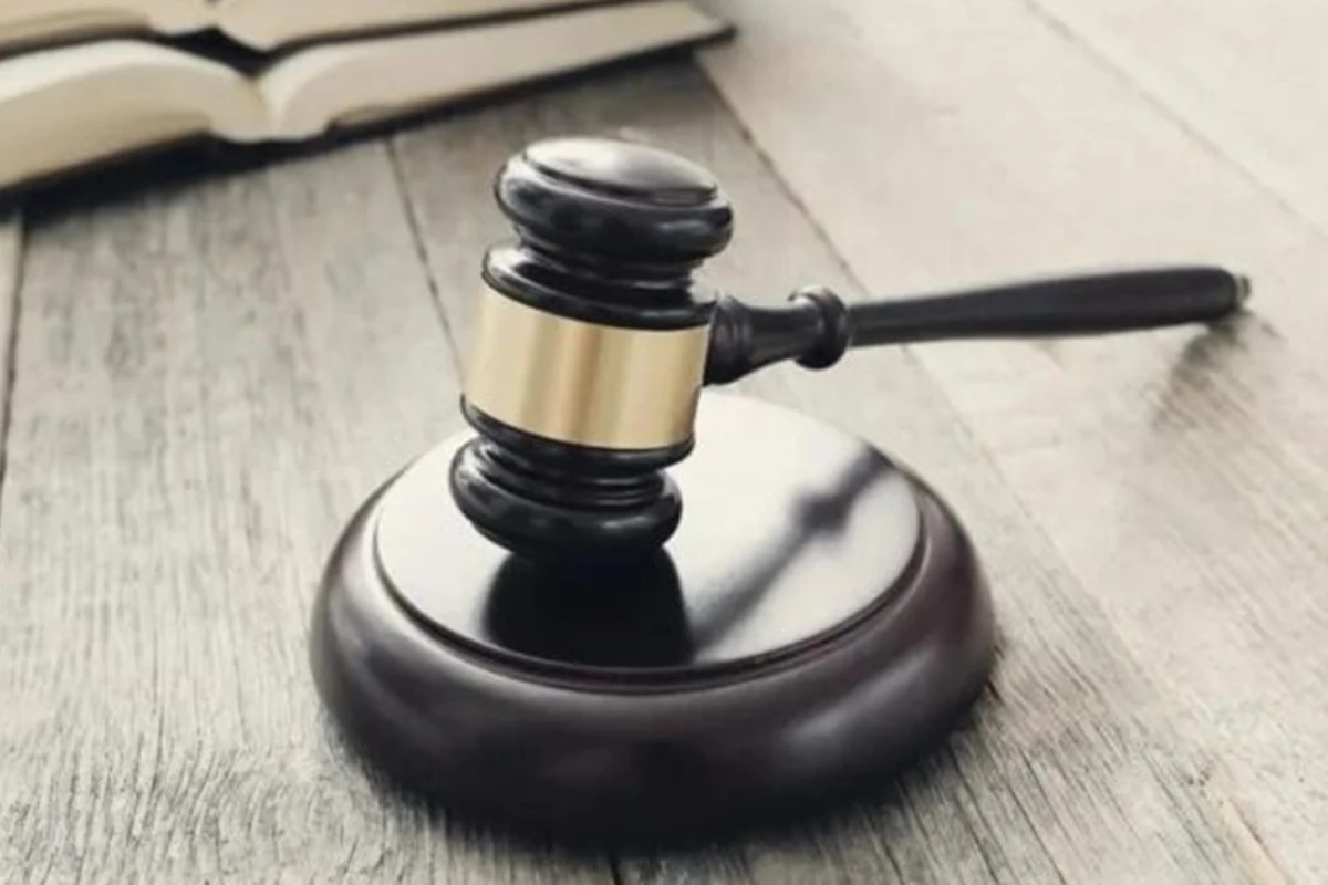 Martelo de juiz sobre mesa de madeira com livros abertos ao fundo, simbolizando justiça e direito.