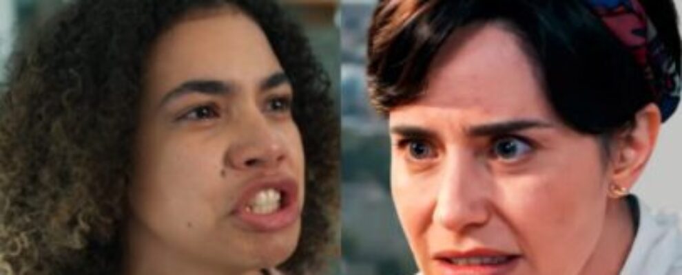 Atrizes de novela brasileira com expressões de raiva e espanto em cena dramática.