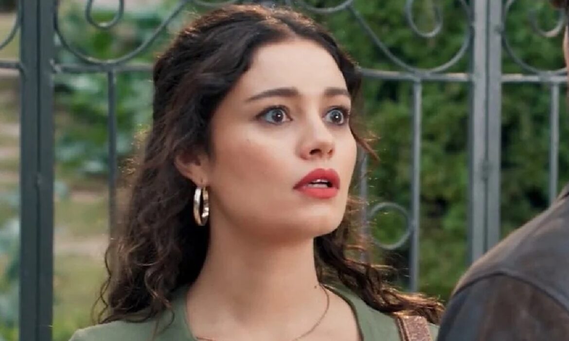 Atriz turca Hande Erçel com olhar surpreso e maquiagem marcante, usando brincos de argola dourados.