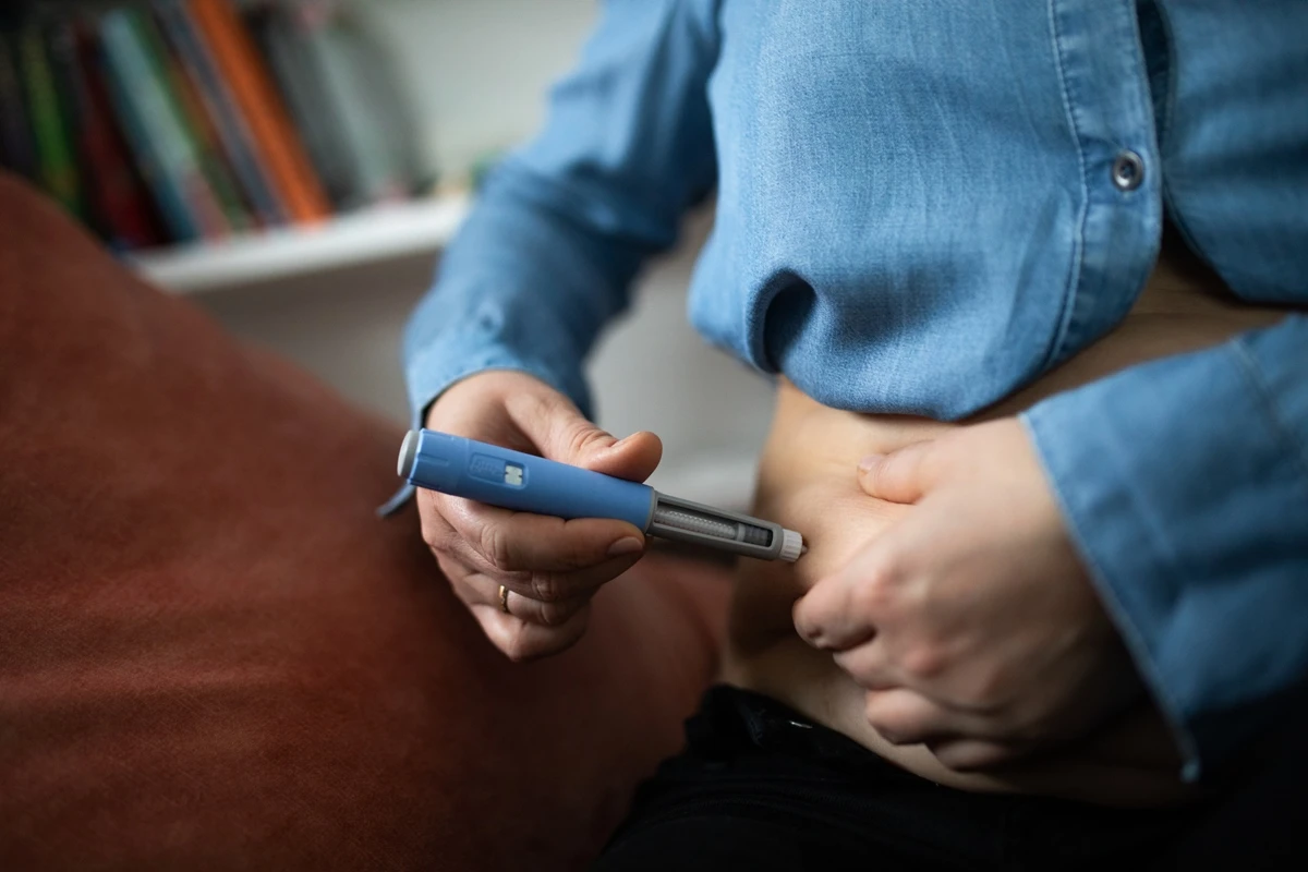 Pessoa aplica injeção de insulina na barriga com caneta injetora azul. Foco nas mãos e no dispositivo.