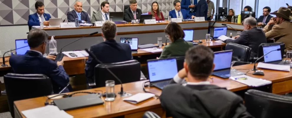 Senadores em reunião em Brasília, com laptops e papéis sobre a mesa. Ao fundo, um homem de chapéu.