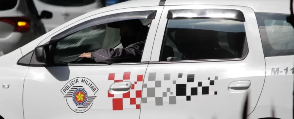 Policial militar dirige viatura da Polícia Militar de São Paulo em trânsito urbano. Detalhe da porta com o logo e a palavra …