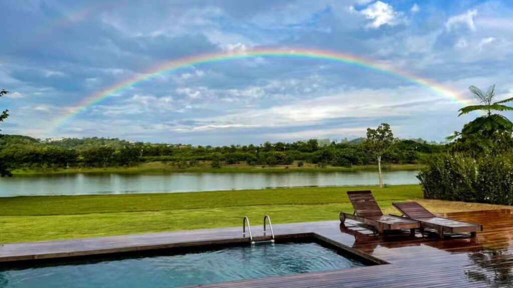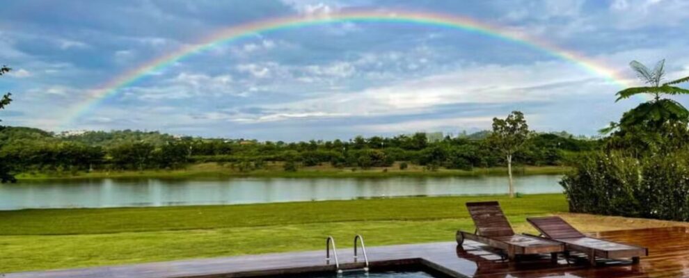 Mas o que tem de tão especial nesse lugar? Olha, a lista é grande! A fazenda foi pensada para unir conforto e a simplicidade da vida no campo. Um dos destaques é um lago gigantesco, que compõe um cenário digno de filme. Ao lado, uma piscina com borda infinita oferece uma vista panorâmica de toda a área verde, sendo o local perfeito para relaxar e curtir o pôr do sol mineiro. A gente só de imaginar já fica com inveja!