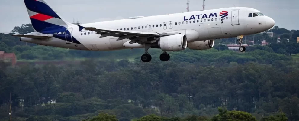 Avião da LATAM com a matrícula PR-MHP pousando em um aeroporto com árvores e prédios ao fundo.