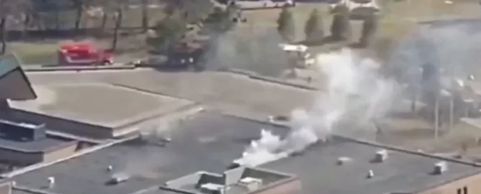 Vista aérea de um prédio em chamas com caminhões de bombeiros e fumaça saindo do telhado.