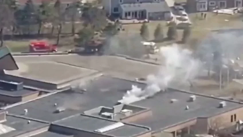 Vista aérea de um prédio em chamas com caminhões de bombeiros e fumaça saindo do telhado.