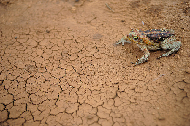Um sapo em solo seco e rachado, com foco no animal e na textura da terra.