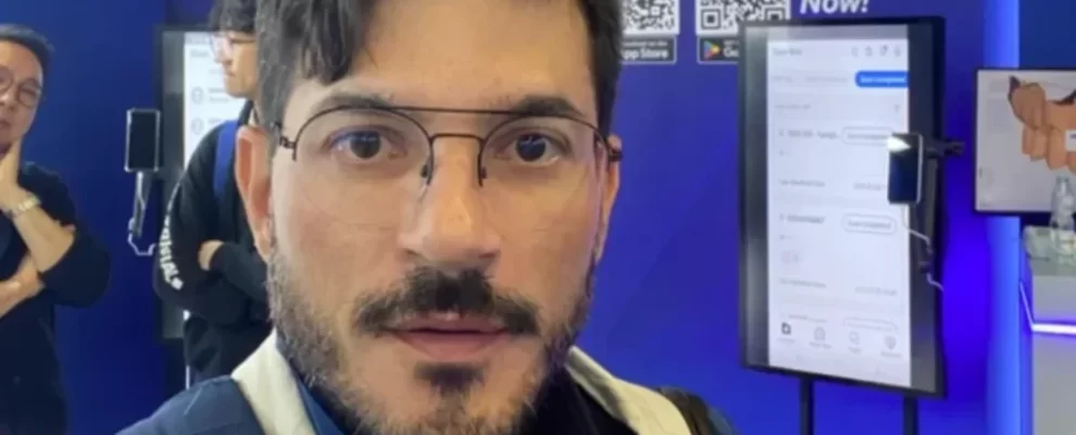 Homem de óculos e barba faz selfie em frente a um painel azul com QR codes e a inscrição 'Medit Mobile App'.