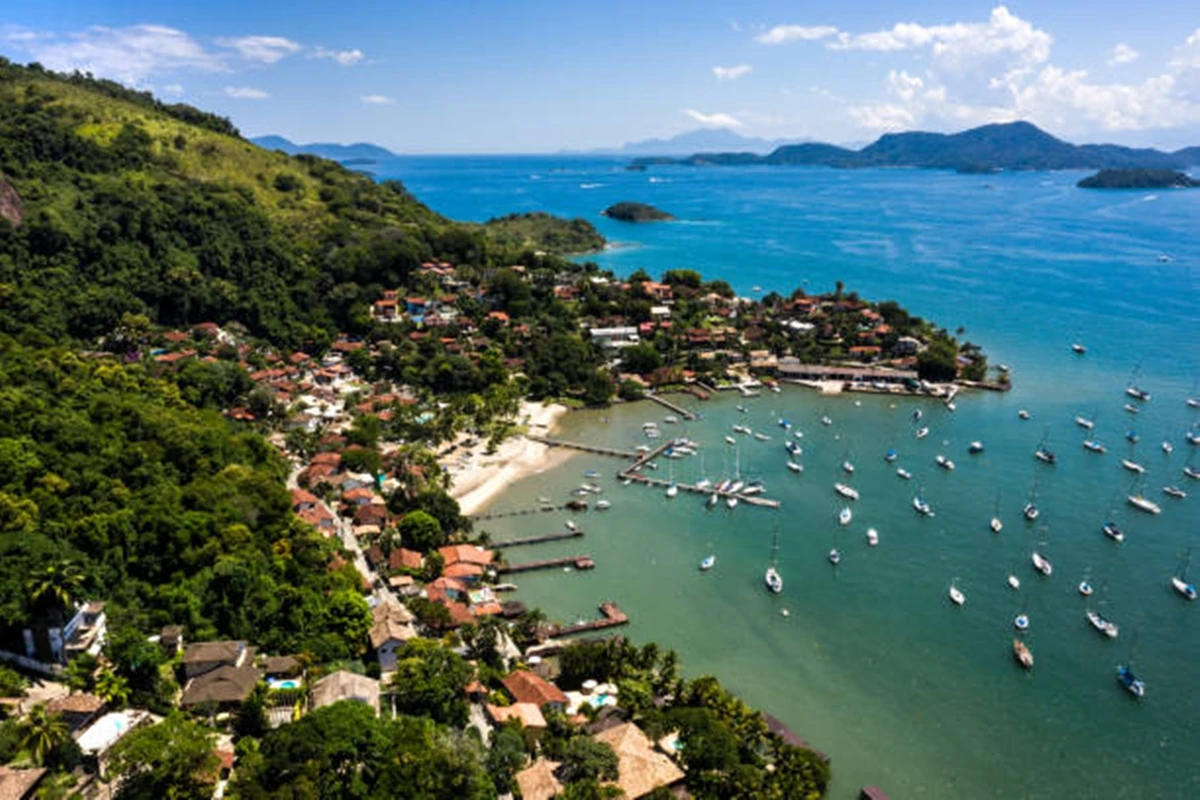 Vista aérea de Angra dos Reis, Rio de Janeiro, com casas, vegetação exuberante e muitas embarcações ancoradas na baía azul.