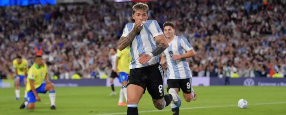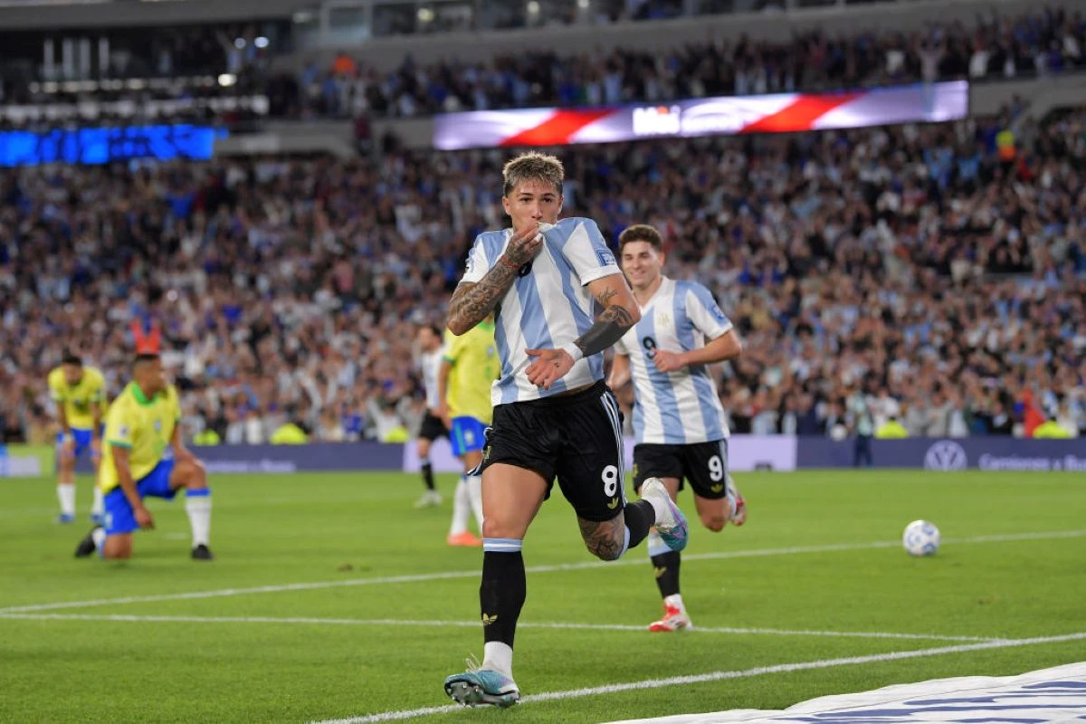 Enzo Fernández comemora gol pela Argentina contra o Brasil, com Julián Álvarez ao fundo. Partida de futebol em estádio lotad…