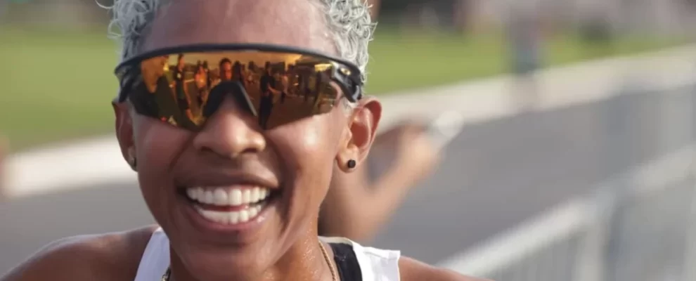 Atleta sorri com óculos esportivos espelhados, reflexo de pessoas em corrida. Cabelos curtos e grisalhos, pele bronzeada.