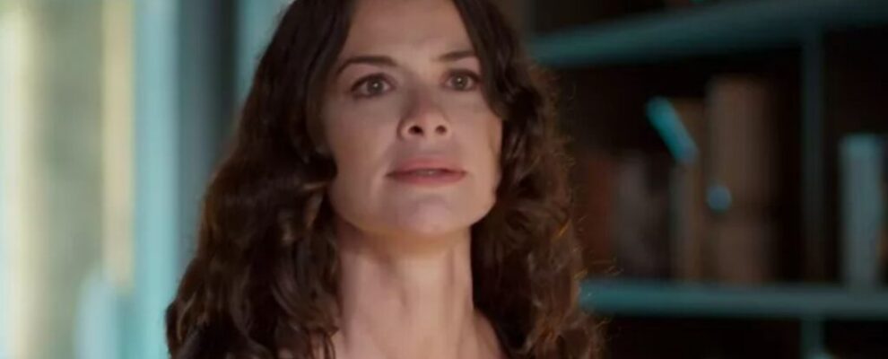 Atriz Alinne Moraes em cena de novela, com cabelos castanhos longos e ondulados, olhando para o lado com expressão pensativa.