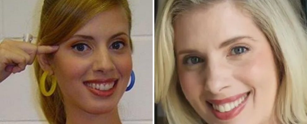 Duas fotos de uma mulher sorrindo. Na foto da esquerda, ela tem cabelo preso e usa brincos amarelos e azuis. Na foto da dire…